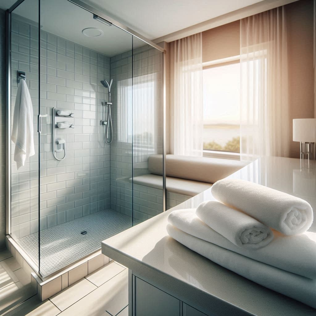 욕실 세면대 주변은 물기 흔적이 거의 남아 있지 않아 사용 후에도 정리가 유지되는 모습이 인상적이었습니다. 수건은 일정한 두께로 접혀 있어 손에 잡는 느낌이 균일했고, 드라이기 전선 길이는 여유로워 거울 앞에서 방향을 바꿔가며 사용하기 좋았습니다. 샤워 부스는 흔들림 없이 고정돼 있어 내부 온도가 쉽게 떨어지지 않았고, 뜨거운 물 수압도 일정해 샤워 중 흐름이 끊기지 않았습니다. 침대 매트리스는 체중을 고르게 받쳐줘 누웠을 때 허리와 어깨가 자연스럽게 정리되는 느낌을 줬습니다. TV 리모컨은 빠르게 반응했고, 와이파이도 접속 후 끊김 없이 이어져 간단한 일정 정리나 검색을 하기에도 충분했습니다. 콘센트 역시 침대 옆과 테이블 근처 두 곳에 배치돼 있어 충전 케이블을 불편하게 늘릴 필요가 없었습니다.